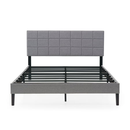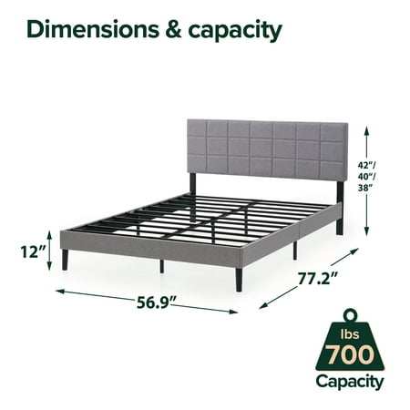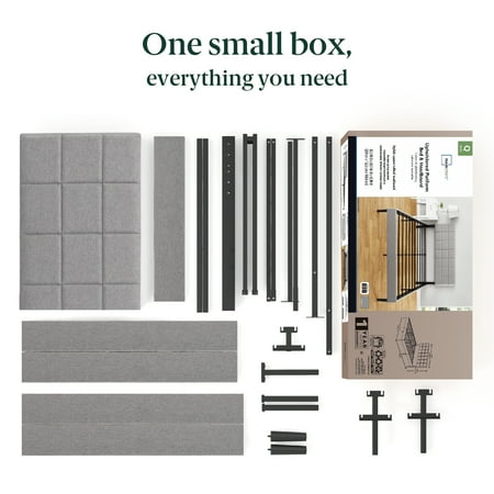 Combining tasteful details and durability, this minimalist Mainstays upholstered platform bed will transform your bedroom. Packed with modern style and traditional comfort from its bold geometric headboard and foam padded upholstered frame. It’s equipped with a metal slat platform made for supporting any mattress without the added box spring. Its framework is constructed with durable steel and center support legs that eliminate sagging and extend mattress life. In other words, your mattress will feel even dreamier on top of this dependable foundation. With all the parts, tools and instructions you’ll need to assemble with the help of a friend. Age Group: Adult, Universal.