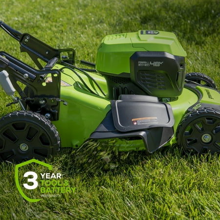 The new Greenworks 48V (2x24V) 20" Brushless Battery-Powered Lawn Mower is engineered for homeowners managing up to 1/3 acre of lawn, delivering a runtime of up to 45 minutes with the included two 4.0Ah batteries. The mower features a 4-in-1 system that allows you to mulch, bag, side discharge, or turbo leaf pickup, providing versatility for any mowing task. With high-intensity LED headlights, you can enjoy optimal visibility and safety during your mowing sessions, even in low-light conditions. Designed with convenience in mind, the folding handles make storage simple and efficient, taking up to 70% less space when not in use. This mower is backed by a 3-year limited warranty on both the tool and battery, ensuring peace of mind with your purchase. Additionally, you can power over 125 tools with any Greenworks 24V battery, making this mower a versatile addition to your outdoor equipment collection. Included in the package are two 24V 4.0Ah batteries and a dual port battery charger for quick recharges in just 75 minutes per battery. Experience the future of lawn care with this powerful and efficient mower!