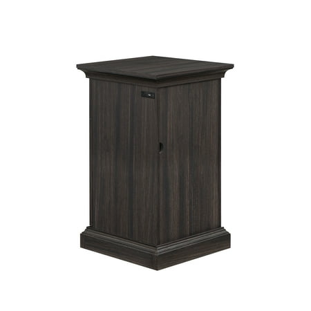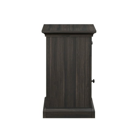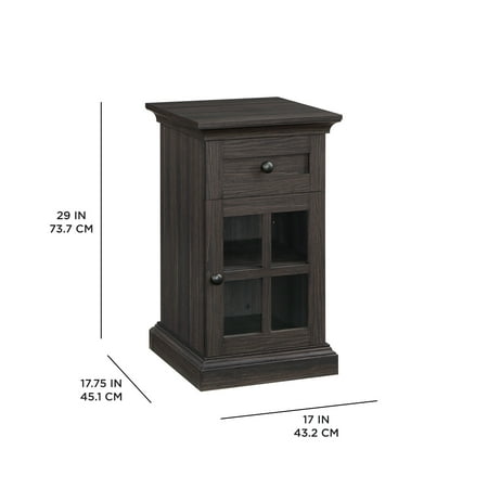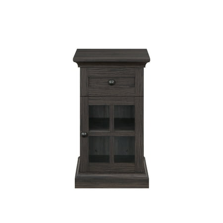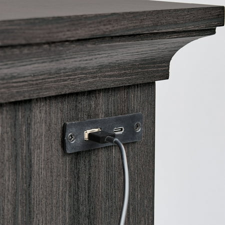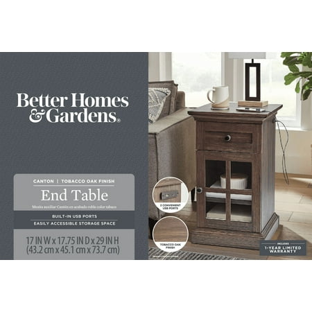 The Better Homes and Gardens Canton End Table will be a charming addition to any home. The table's lower cabinet space provides ample storage for larger items, such as blankets or books, while the upper small storage drawer is perfect for storing smaller items like remote controls or writing utensils. This versatile combination of storage options makes this table a practical and functional choice for any room in the house.The power station includes (1) USB & (1) USB-C charging ports conveniently located on the side. The back of the cabinet features a small cutaway for easily plugging in cords or cables. This rustic aesthetic is further enhanced by the Tobacco Oak finish and decorative metal hardware with gunmetal finish. Despite its traditional design, this table can be easily integrated into a variety of decor styles. Create the complete living room scene with the Better Homes & Gardens Canton TV Console or other piece from the Canton Collection (all sold separately). Product Dimensions: 17” x 17.75” x 29”