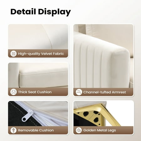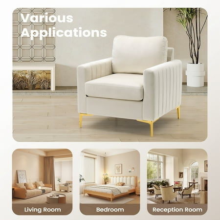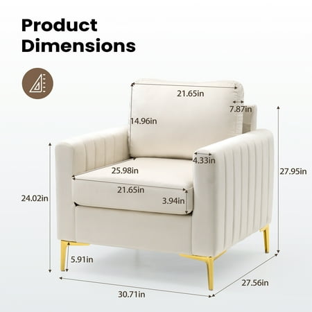 The frame is made from engineered wood, and it rests on bracket feet in a gleaming gold hue. Foam covers the high square arms, pillow back, and plump cushion seat. Sumptuous velvet that feels soft and looks luxe adds a glam, elevated look. We love the channel tufting on the arms. This armchair requires full assembly, but the good news is all tools are included. Features Strong and durable - Perched atop sturdy metal legs bonded with a manufactured wooden frame, the entire chair is very stable. Design - This perfect accent club chair with a tufted design and golden metal legs is suitable for the living room, office, bedroom, and other scenes. Easy to assemble - Simple in structure, you can build this chair with minimal effort Specifications: Color:Gray,White Materials:Manufactured wood,metal frame Weight Capacity:250lbs Overall size:30.71"*27.56"*27.95