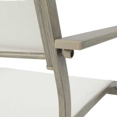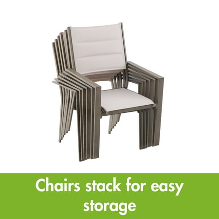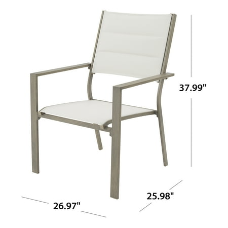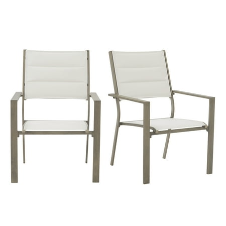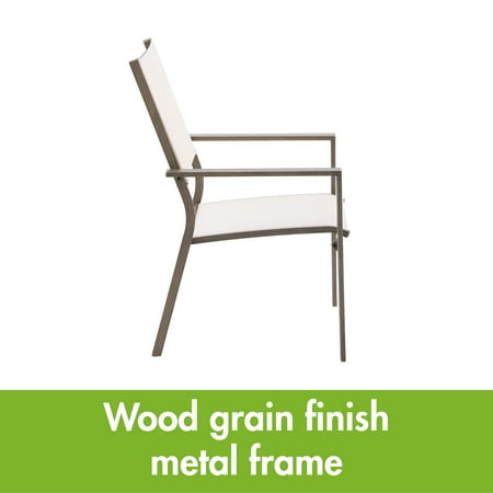 Entertain family, friends, and neighbors at outdoor parties, barbecues, and special gatherings in comfort and style with the Mainstays Dashwood Steel Outdoor Dining Armchair - Set of 2, Gray/Cream. This outdoor armchair set features a simple, elegant design with a gray, wood-grain finish on the metal frames and cream-colored, all-season fabric with padded seat backs. The chairs complement almost any other outdoor furniture and decor. The sturdy frames are constructed of steel with a powder-coated finish for rust resistance and long-lasting durability, and the seats and backs are crafted of fade-resistant sling fabric. Give your porch, patio, or deck an easy, stylish makeover with the Mainstays Dashwood Steel Outdoor Dining Armchairs, and enjoy years of casual comfort.