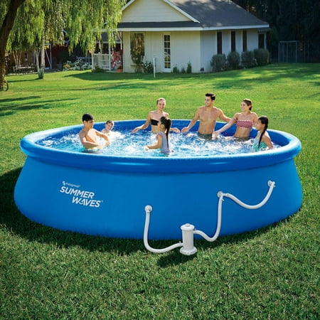 Cool off this summer with our Summer Waves Quick Set Above Ground pool. This durable PVC pool is generously sized, 15 ft. Dia x 42 in. D. Extremely easy to set up, requiring only a flat surface, air pump (sold separately) and access to a water hose. Lay the pool out on a flat surface, then inflate the top ring and fill the pool with water. The inflatable ring design prevents water from spilling out once full. Quick Set Ring Pools are a great alternative to traditional pools which can be time-consuming to install and maintain. This pool is equipped with a heavy-duty RP1000 filter pump, and comes with 2 cartridge filters, which will help maintain the water clarity. This pump is hassle free, and easy to install- simply hook-up the hoses as directed in the manual. The powerful filter pump will keep your water clean and fresh throughout the season, giving you endless hours of splash time and unbeatable value. We recommend replacing your filter every 2-weeks to get the maximum benefit from your filter. Additional filters sold separately. Our pumps are also equipped with the Ground Fault Circuit Interrupter (GFCI), which is an added safety feature that shuts off the pump if any electrical current is exposed to water. Take a break from the summer heat with this fun, convenient Summer Waves Above-Ground Quick Set Swimming Pool.