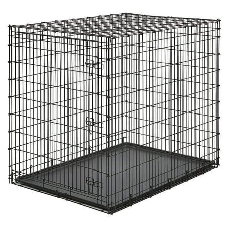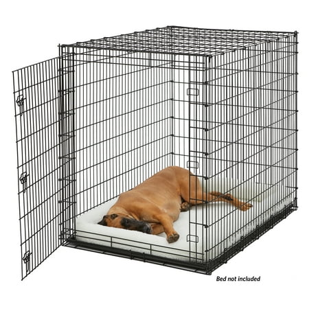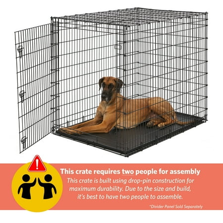 The extra, extra-large single door metal dog crate by MidWest Homes for Pets is specifically designed for the largest breed of dog breeds, including Great Danes, Mastiffs, and St. Bernards. This durable, heavy duty three secure slide-bolt latches on the door, four rubber 'roller' feet to protect your floors and a durable easy to clean leak-proof plastic pan. This 'ginormous' dog crate utilizes drop-pin construction (4 drop-pins) ensuring maximum durability to safely and securely handle large breed dogs.