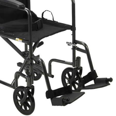 Drive Medical Transport Wheelchair Steel 17 inch Seat Width 250 lbs. Weight Capacity , 1 Ct Use Drive's transport chair to easily move family, loved ones, or patients around the home or on-the-go. Transport chair safely supports users up to 250 lbs. with the padded armrests, comfortable 17-inch nylon seat, and swing-away footrests. Aluminum frame transport chair easily collapses in a two-step method for convenience, travel and storage. Lightweight transport chair weighs only 26 lbs. When assisted by a caregiver, transport chairs merge the functionality of a wheelchair with the portability of a rollator. Chair features built-in seat buckles and rear locks for added safety. 1 Transport Chair 250 lbs. Weight Capacity