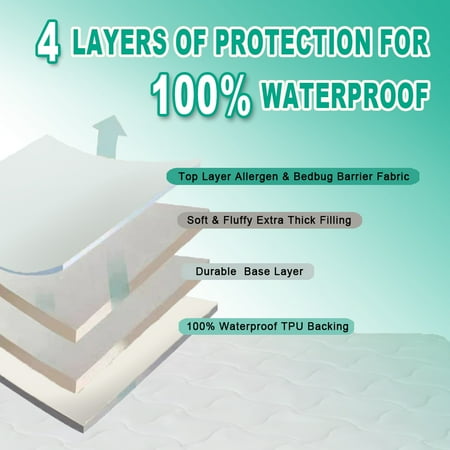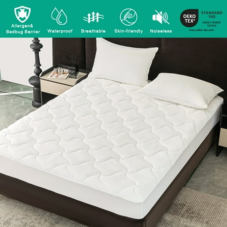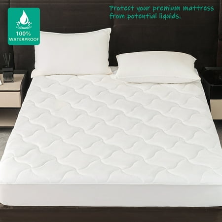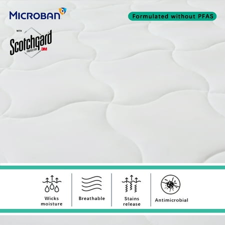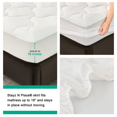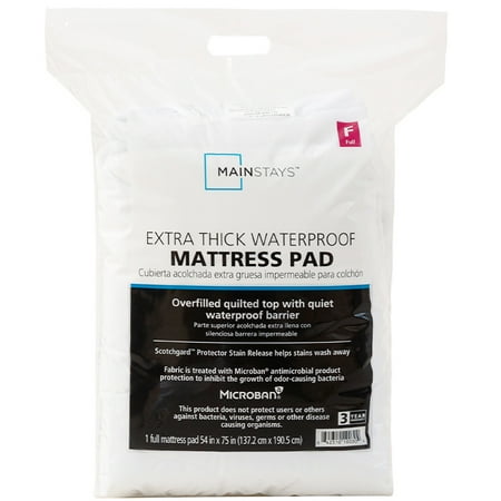 Keep your mattress protected with the Mainstays Extra Thick Waterproof Mattress Pad. This soft and durable pad uses a 100% polyurethane laminated quiet barrier to provide premium waterproof protection for your mattress. It features a 100% polyester microfiber top in an attractive quilted pattern that's treated with Scotchgard Stain Release and Moisture Wicking to help keep the extra-thick mattress pad looking fresh and clean while wicking away moisture for cool and breathable fabric. The Mainstays Extra Thick Waterproof Mattress Pad has a Stayz N Place skirt that fits mattresses up to 18" thick to stay in place firmly without slipping and sliding during the night. Easily cared for, simply machine washes this pad as needed. Available in Twin/Twin XL, Full, Queen, and King Sizes.