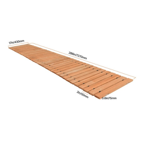 Product Description 288 x 17 in Straight Wooden Garden Pathway Experience the beauty and functionality of our wooden garden pathway. Crafted from high-quality pressure-treated cedar, this pathway not only adds a touch of elegance to your outdoor space but also prevents mud and offers stability. With its non-slip design, you can confidently walk on it without any safety concerns. Whether you have a garden, patio, or need a pathway for gatherings, this versatile pathway is the perfect solution. Its space-saving design allows for easy storage when not in use. Embrace the aesthetic appeal, sturdy construction, and durable cedar material of this pathway, making it a valuable addition to any outdoor setting. Elegantly Crafted Indulge in the natural beauty of this wooden garden pathway, meticulously crafted from handpicked wood. Its exquisite textures and captivating hues effortlessly enhance the charm of your yard, infusing it with a touch of timeless elegance. Long-lasting and Resilient Constructed with premium-grade materials, this garden walkway is built to withstand the test of time. Its exceptional durability ensures that it remains unscathed and resilient, ensuring a lasting investment that enhances your outdoor environment. Effortless Maintenance Maintaining the pristine appearance of this wooden garden pathway is a breeze. A simple rinse is all it takes to keep it looking fresh and new, eliminating the need for complicated cleaning routines and allowing you to enjoy a consistently beautiful yard. Quick and Easy Installation Say goodbye to the hassle of tools and complicated setups. This garden walkway can be effortlessly unfolded and put to use immediately, saving you valuable time and effort. Create a stunning garden path with utmost ease and convenience. Adaptable for Any Setting From sandy beaches to snowy landscapes and even gravel paths, this wooden garden pathway seamlessly adapts to any scenario. Its versatility ensures a stable and visually appealing walking surface, no matter the environment. Reliable Load Capacity and Endurance Rest assured, this garden walkway is designed to withstand heavy loads. With its robust load-bearing capability, it provides a secure and durable surface for pedestrians, strollers, and even lawn mowers. Safety and longevity are guaranteed for years to come. Specifications Item Model Number: PW-S24 Length: 288inches Width: 17 inches Thickness: 0.6 inches Rope Type: Rust-Resistant Steel Wire Main Color: Brown Primary Material: Cedar Wood Package Dimensions: 24.4 x 17.7 x 9.7 inches Package Weight: 17.85 kg / 39.34 lbs Package Content 1 x Wooden Garden Pathway