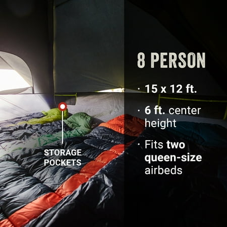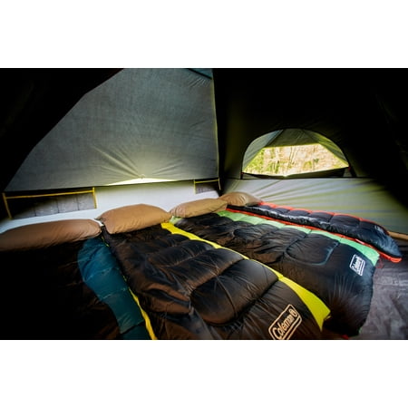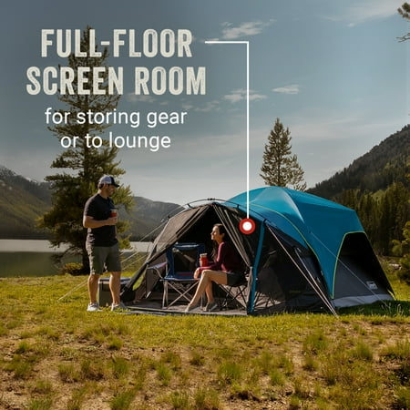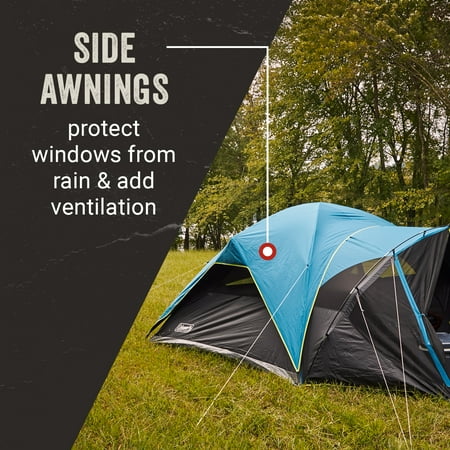 Sleep in past sunrise or put the kids to bed early with the Coleman 8-Person Carlsbad Dark Room Dome Camping Tent with Screen Room. The tent blocks 90% of sunlight and reduces heat inside the tent (vs. a comparable Coleman tent) for more comfortable rest at any time. Fast Pitch technology allows you to set up the tent fast using pre-attached poles and hub, fast fit feet, and snag-free clips so you can get the fun started. A separate screen room lets you store gear and watch nature unfold while keeping the bugs away. If it rains, this tent helps you stay dry thanks to the WeatherTec system's tub-like floor, patented welded corners, and inverted seams which all help keep water out. Plus, the strong frame withstands 35 mph winds. Awnings on the sides of the tent protect windows from rain and add extra ventilation so you can enjoy relaxing inside. These Carlsbad Dark Room tents are available in a range of sizes: 4-person, 6-person, and 8-person.