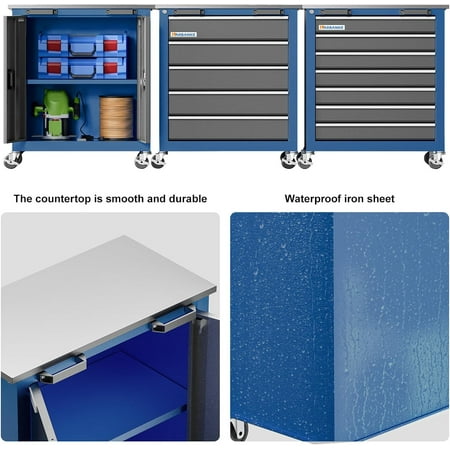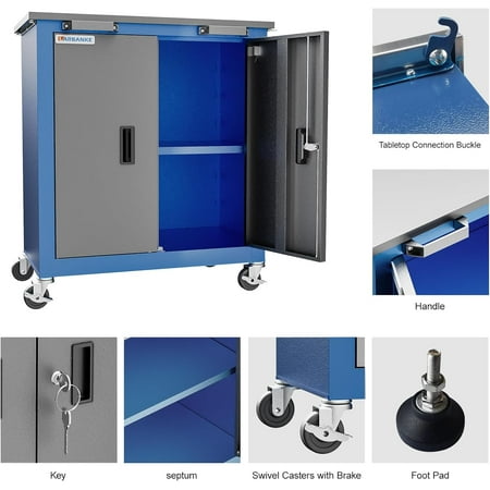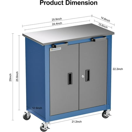 Product Description LARBANKE Tool Cabinet Color:Blue and Grey Material:Metal Prodcut Size:29'' H * 25.9'' W * 14.8'' D Tool Chest can store many common tools in the garage, taking up less space and making the garage environment more tidy. Worktop Tool Cabinet also features a stainless steel work surface to work and display items on, and can be combined in multiples to form a large tool cabinet. Connecting Locking Buckle When you buy more than one tool cabinet, you can combine them into workbenches with Connecting Locking Buckle. Handle Handle saves effort when moving tool cabinets Lockable Tool Cabinet Lockable door with two keys inside to protect tools and items Wheels and padded feet The tool cabinet is equipped with 360°brake wheels and padded feet,two modes of tool chests, according to your needs to switch freely! Adjustable Shelves Tool Storage Cabinet locker with adjustable shelves you can adjust the height of the shelves as needed, to place a variety of items.