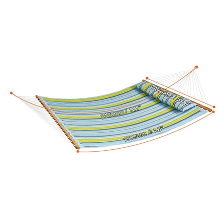 Product Description KFFKFF Double Quilted Fabric Hammock Indulge in outdoor relaxation with KFFKFF double quilted fabric hammock. Crafted for lasting comfort and reliability, our hammock features 200g quilted cotton and reinforced ends. Supported by hardwood spreader bars, handwoven ropes, 480lbs weight capacity, it offers long-lasting outdoor fun. 480lbs Large Weight Capacity Solid and reliable, our double quilted hammock is supported by 18 sturdy handwoven ropes, ensuring a safe and secure experience. With reinforced fishtail knots and metal rings, it can support up to 480 lbs, accommodating two persons on its spacious 75 x 55-inch bed. 55-Inch Hardwood Spreader Bar The 55-inch hardwood spreader bar ensures even weight distribution, maintaining stability and preventing tipping. Meticulously polished and varnished for durability, it's built to last. Additionally, each rope hole is smoothed to minimize friction and prolong the rope's lifespan. Thoughtful Details You Can See Details matter when it comes to stability and safety: metal rings and fishtail knots keep you securely lounging, while two 14-inch galvanized chains minimize excessive swinging. Plus, the detachable soft pillow adds an extra layer of comfort for ultimate relaxation. More Options to Choose From With a variety of trendy colors and styles available, our quilted fabric outdoor hammock caters to a wide range of tastes and preferences. Whether you prefer vibrant hues or classic designs, you're sure to find the perfect hammock to complement various outdoor settings. Comfortable Double Quilted Fabric Hammock Embrace nature and indulge in perfect relaxation. Crafted from premium materials, our comfortable double quilted fabric hammock allows you to unwind effortlessly as you sway gently. Whether it's outdoor camping, balcony lounging, or indoor leisure, it's the ultimate choice. Exquisite Craftsmanship for Durability Crafted with precision and using durable materials, this hammock ensures longevity. Ideal for outdoor living, it provides the perfect retreat to unwind and enjoy the gentle breeze of lazy afternoons. Specifications Item Model Number: ZBJM-03 Product Color: Green Stripe Support Stand Type: Without Stand Spreader Bar Type: Straight Hardwood Maximum Load Capacity: 480lbs Bed Dimensions: 55.1 x 74.8 in / 1400 x 1900 mm Total Unfolded Length: 122 in / 3100 mm Net Weight: 10.5 lbs / 4.75 kg Package Content 1 x Hammock 1 x Soft Pillow 2 x Polyester Straps 2 x Galvanized Chains 2 x D-Rings 1 x Storage Bag