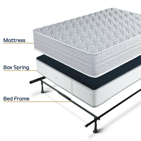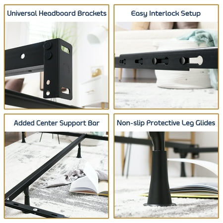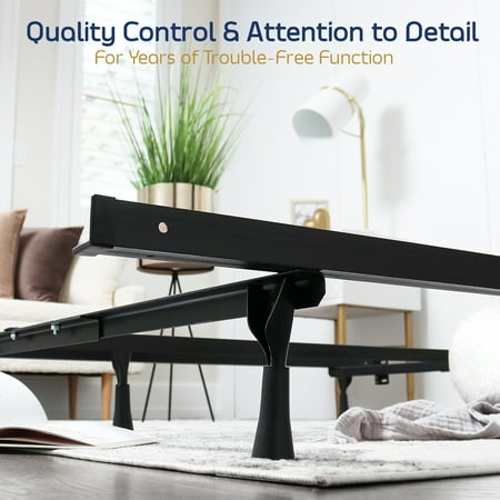 Nestl ADJUSTABLE BED FRAME Designed for your box spring and mattress set, this adjustable bed frame expands to suit your needs, conveniently adapting to fit standard Twin, Full or Queen size. Constructed with heavy-duty steel that provides secure support, with a center leg and cross rail for additional stability, and recessed outer legs to reduce accidental bumps. Our bed base includes built-in headboard brackets, and has about 5” clearance beneath the frame, giving you room for underbed storage. Dimensions: 39” x 75” - 54” x 75” - 60” x 80”. Effortless setup in just a few minutes, with all hardware and instructions included. Adjusting the frame to another size is quick and easy with our interlock system. SIZE: 39" - 54" - 60'' ASSEMBLY SYSTEM - INTERLOCK SLOT TOLERANCE Adjusts to 3 Sizes: Twin: 37 ¾'' to 38 7/8'' Full: 52 ¾'' to 53 ¾'' Queen: 59 3/8'' to 60 1/16''" SIDE RAILS: 1 ¼" x 1 ¼" x 67 7/8" CROSS RAIL: 1 ¼" X 1 ¼" X 32" CENTRE SUPPORT: 1 ¼" X 1 ¼" (head to toe) FLANGE: #500 FLANGE POSITION: Towards the bottom FROM THE FLOOR: 5 ¼" from the floor - 2 ½" c.c. LEGS: 4 Re-enforced + 1 Regular SPECIFICATIONS: 1 Centre support with one leg; Centre support in diagonal at 54" SIZE OF BOX: 71" X 6 ½" X 2 1/8" HEADBOARD BRACKETS: 4'' WEIGHT: 24 lb Includes: -2 Angle protectors 1 ¼"" -4 Sockets-2 Carriage bolts 5/16'' X ¾''" -2 Nuts 5/16'' -4 Washers -5 Plastic Glides