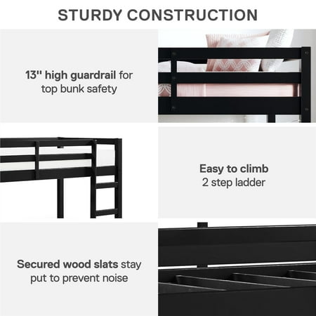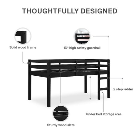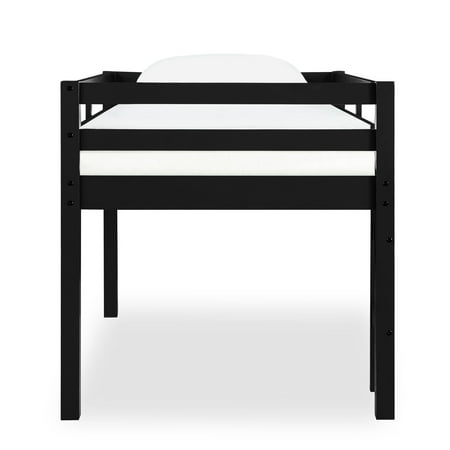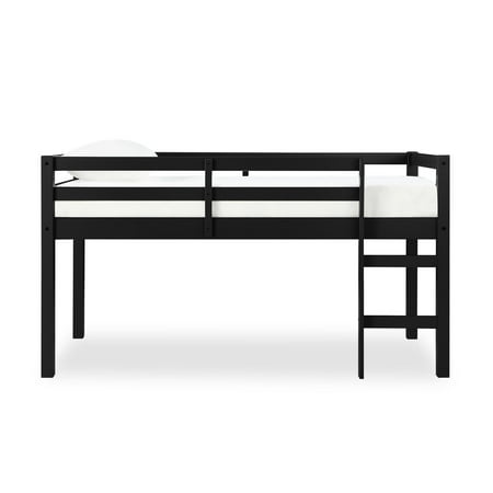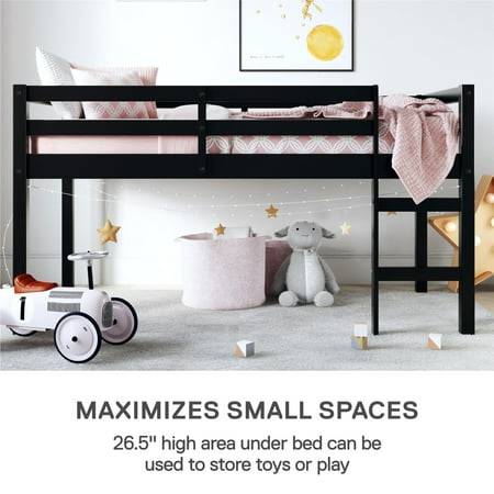 Let your child’s creativity run wild with the stylish, fun and functional design of the Dorel Living Milton Twin Loft Bed. With a sturdy wood construction and a bold black finish, the Milton will easily fit into any new or existing decor, bringing a simple, traditional design that draws attention to its clean lines, horizontal paneling and space saving silhouette. The low height ensures a safe climb at bedtime and combined with space below for storage, reading, building a fort, or whatever their imaginations can dream up. With a compact footprint perfect for small spaces, the Milton features an easy climb stepladder and a full-length guardrail for additional safety. The Dorel Living Milton Twin Loft Bed brings a ‘Mission’ inspired style to your child or guest bedroom with an open, airy feel that perfectly captures a fun and casual aesthetic. Features : Traditional small spaces junior twin size Dorel Living loft bed Low height design Sturdy wood construction Specifications : Product Dimensions : 43" H x 78.75" W x 43.75" D Product Weight : 58.75