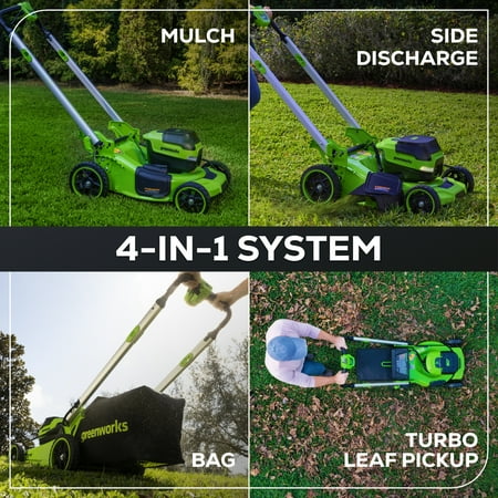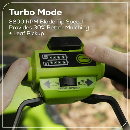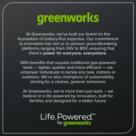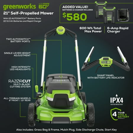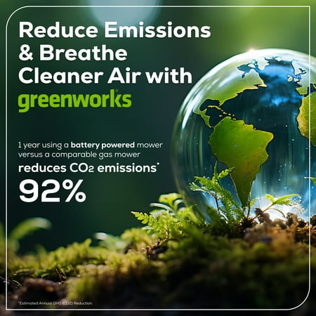 The Greenworks 60V 21” Self-Propelled Walk-Behind Mower stakes its claim as the rightful lawn titan. More powerful and easier to use than gas. Forget about the fuss and fumes with this intelligently powered walk-behind mower. Greenworks 60V mowers offer best in class cutting performance. The muscle of this mower flexes with its heavy-duty 21-inch stamped steel deck. Better, more intelligent power than any of its gas competition , the 21-inch cut delivers superior cut quality with premium blade speed and RPMs ranging between 2800-3200. The mower features dual blades to ensure the best cut quality while increasing the performance of mulching and bagging. Runtime is a sure thing with the included (2) 5Ah batteries and dual-ports with one active port and one port for storage, longer runtime with two batteries. Powerfully easy. Simple to start with just the push of a button. Effortless to mow because it’s self-propelled and lightweight at only 65 lbs. The RWD self-propel system in this mower provides traction toward the center of the mower helping you move up and down hills more easily. Gentle on the ears because it mows quietly. Easy to store in small spaces—you can even hang it up if you want to. Cuts better than gas and absolutely no maintenance, the max blade speed is at an impressive 3200 RPMs for when you need to cut through the thickest challenges. With 75 minutes of runtime and a powerfully tough 21-inch steel deck this mower comes to play with the best. The mower is equipped with high-intensity LED headlights that provide visibility for early mornings or late nights. The turbo button provides excellent lift for leaf-pickup and takes the mower to maximum power. Fully charge the included batteries in 100-minutes. Designed to be quiet at only 84 dB, mow where the gas guys can’t, also forget the gas can, oil, spark-plug, fuel-filter, and air filter. This mower will not only give you a premium performance but will also have a five-year cost savings of $619 compared to using a 21” gas-powered walk-behind mower. With 80% fewer moving parts than gas there is significant higher profitability with the powerful Greenworks 60V 21” Self-Propelled Mower. No gas smell, no emissions, no maintenance, and low noise.