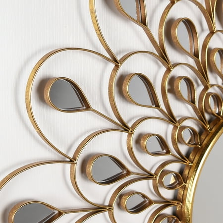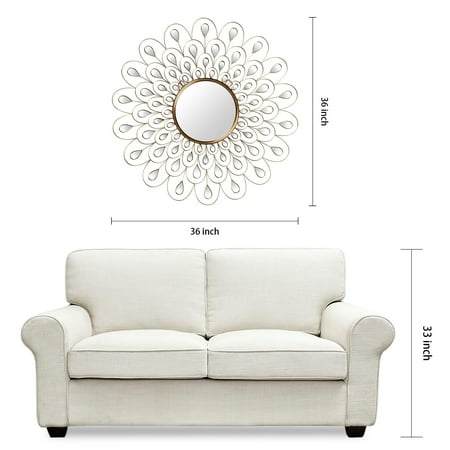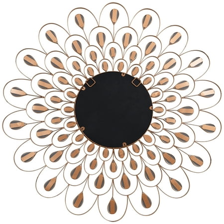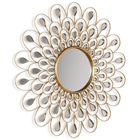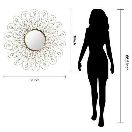 This 36' x 36' stunning wall mirror is constructed with a round glass mirror surrounded by many smaller acrylic mirrors to appear like a sunflower. Wrapped around the mirrors is a metal frame with handmade gold foil that intensifies the design of the sunflower and increases the elegance of the mirror.This wall mirror is ideal for adding more utility to a wall and enhancing the space of a room, making it feel larger and lighter.2 hangers are attached to the back of the mirror for quick and easy installation. Packaged in strong carton with full protective corners and styrofoam. MDF base covered with round clear glass mirror panels, surrounded by many smaller acrylic mirrors ,Bathroom, Vanity, Bedroom Mirror Weight: 15 Lb Length: 36 Width: 36 Height: 1.18 In Color: Golden Size: 36' x 36' x 1.2' Material: MDF- SKU: ZX99EPAD3061