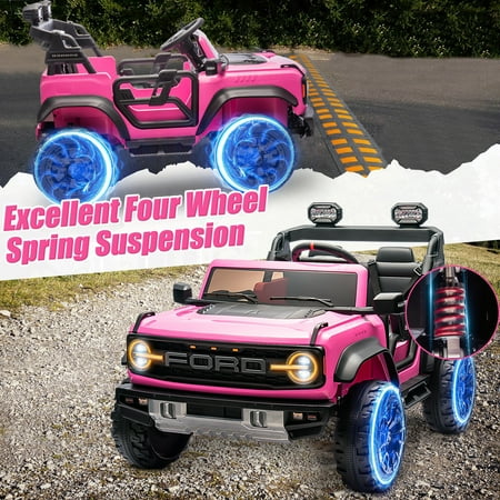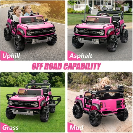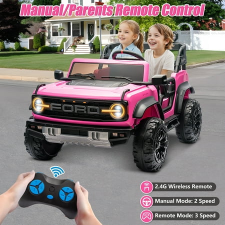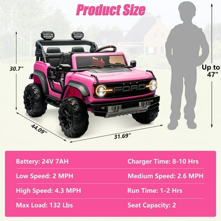 Introducing the Officially Licensed Ford Bronco Raptor 24V Ride-On Car—the ultimate adventure vehicle for kids 3-8! This authentic 24V 2-seater ride-on car delivers thrilling speeds up to 4MPH with its dual 90W motors and long-lasting battery. Featuring parent remote control with emergency brake and independent pedal steering, it offers safe dual-operation modes. Kids enjoy a realistic driving experience with working LED lights, Bluetooth/FM music, and rugged 4-wheel suspension for smooth terrain handling. Built with a durable metal frame (132lb capacity), seat belts, and anti-skid wheels, this electric car for kids combines safety and excitement—perfect for shared playtime and gifting! 🥇Specification🥇 Product Name: Kids ride on cars Product Dimensions: 44.09" x 31.69" x 30.7" Weight: 55.99 lbs Recommended Age: 3-8 Years Weight Capacity: 132 lbs Battery: 24V 7Ah Drive Motor: 90W * 2 *Important Notes: - Supervision Required: Children under 3 years must be accompanied by an adult during use. - Age & Fit Guidance: Recommended ages (3-8) are a reference only. Verify dimensions (44.09"L x 31.69"W x 30.7"H) against your child’s height/weight before purchase. - Battery Safety: Adults must handle charging (8-12 hours). Use only the provided charger.