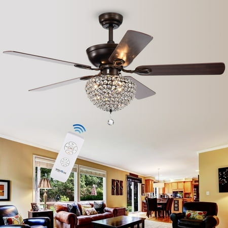 Circulate air throughout your indoor space for enhanced comfort and energy savings with this ceiling fan and light combination with a reversible motor. The crystal basket lampshade with drop pendant crystal adds sparkle to the room. Features Metal, antique bronze, and crystal construction Crystal shades Requires three E26 60-watt bulbs (not included) Forward/reverse motor Hand-pull switch Five wooden blades, each 20.25 inches long x 6 inches wide Blade pitch of 12 degrees Motor house size: 11.8 inches in diameter x 4.7 inches tall Downrod: 4.9 inches Overall height: 22.4 inches 3 motor speeds: 175 (Level 1), 135 (Level 2), and 100 RPM (Level 3) Dimensions: 52 inches in diameter x 23 inches tall This fixture must be hardwired. Professional installation is recommended. Assembly Required