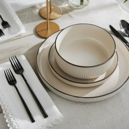 Elevate your dining experience with the Thyme & Table 20-Piece Stainless Steel Arden Flatware Set in sleek black. Crafted with quality stainless steel, each piece exudes durability and style, perfect for everyday meals or special occasions. The set includes service for four, featuring dinner forks, salad forks, dinner knives, dinner spoons, and teaspoons, ensuring you're well-equipped for any meal. With its modern design and sophisticated finish, this flatware set effortlessly complements any table setting, adding a touch of elegance to every dining moment.