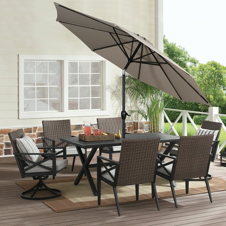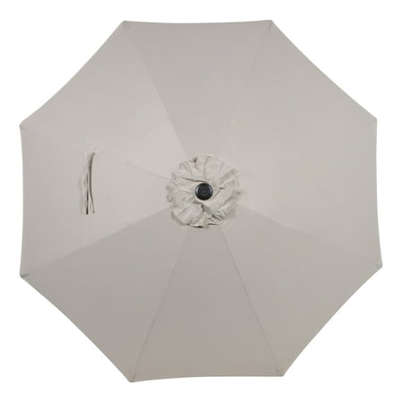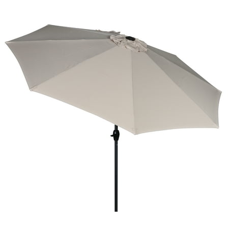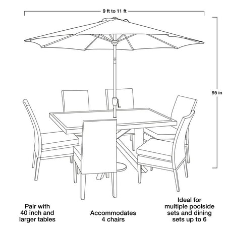 The Mainstays outdoor 9 foot round market patio umbrella features a crank-lift handle making it easy to open and close the canopy. Includes 3 position tilt to adjust to the angle of the sun. Made with weather and fade-resistant 50% recycled polyester fabric and a powder coated steel frame. For use either through a table with a 26lb base or freestanding with a 75 lb. base. Please ensure you always use an umbrella base to secure your umbrella and close when not in use to prevent damage.