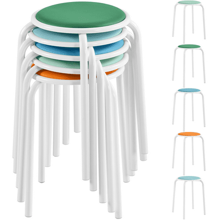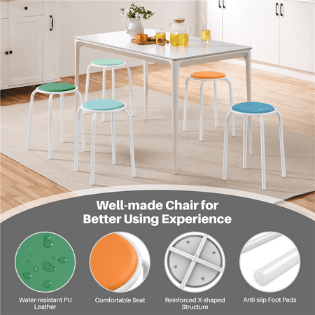 Designed for comfort and convenience, this Stackable Stool Set features faux leather-wrapped, foam-padded seats for a cushioned sitting experience. The sturdy powder-coated metal legs, reinforced with an X-shaped support, ensure stability and hold up to 267 lb with ease. With an 18″ seat height and a lightweight build of just 3.9 lb each, these stools are easy to move and store. Their space-saving stackable design makes them ideal for indoor/outdoor gatherings, study rooms, offices, and communal spaces. Featuring a mix of five vibrant colors, they add a modern touch to any setting—no assembly required!