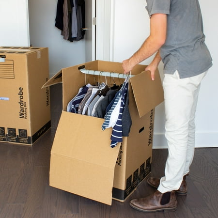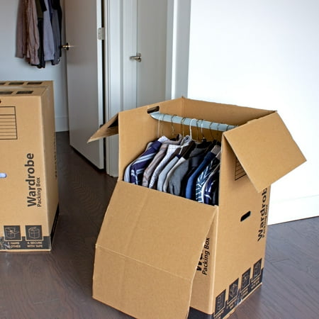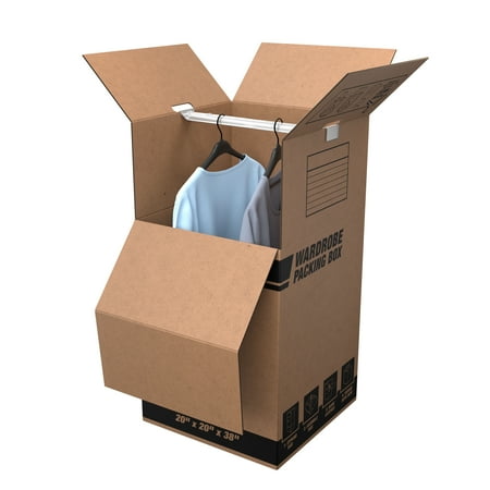 This Pen+Gear Wardrobe Box is made from 100% recycled material. It is ideal for moving or storing hanging clothing items with ease, but can also be used to move or store other large or bulky items. This box is 20" x 20" x 34", and ot is easy to assemble. It includes a 20 inch metal hanging bar to support optimal weight. This Wardrobe Box features hand holes for easy carrying, and a pre-printed contents label for convenient labeling.