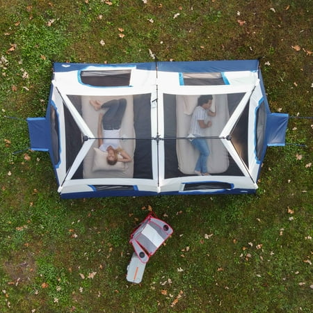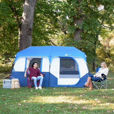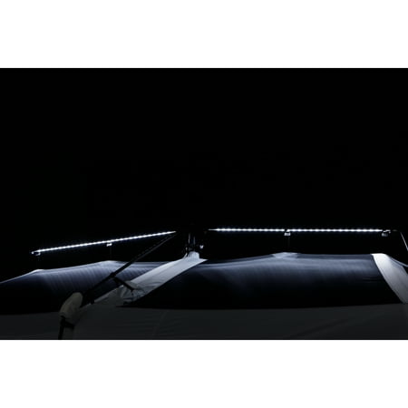 Step up your next outdoor adventure with the Ozark Trail 8-Person Instant Cabin Tent with LED Lighted Poles. This spacious cabin-style tent requires no assembly because the poles are pre-attached to the tent, so all you need to do is unpack, unfold, and extend. This tent features six large mesh windows and two adjustable AC vents for improved air circulation throughout the tent. This tent comfortably fits two queen airbeds or up to 8 campers in sleeping bags on the floor. Keep yourself organized and connected with the included mesh storage pockets and electrical cord access. The ambient LED-lighted poles allow for amazing light throughout the tent and can be adjusted with the low, medium, and high settings. This tent features an anti-snag door zipper, no-see-um mesh, and a 1200mm water-resistant coating. This Ozark Trail 8-Person Instant Cabin Tent with LED Lighted Poles is perfect for your next family camping adventure.