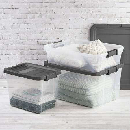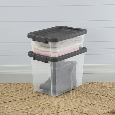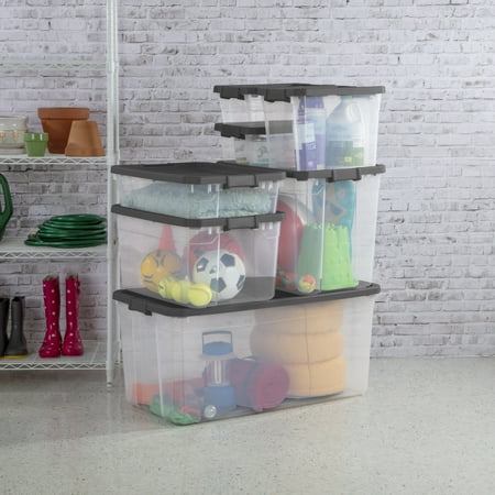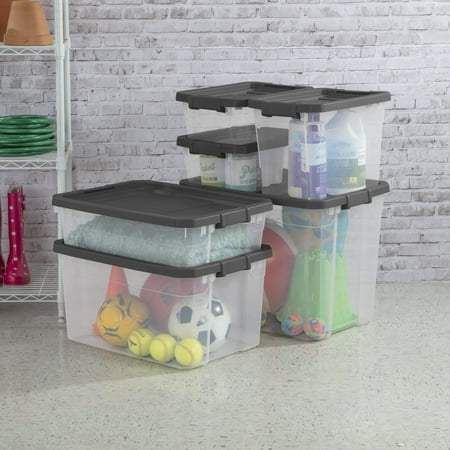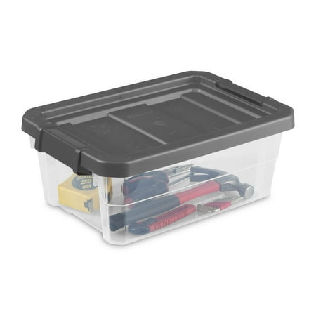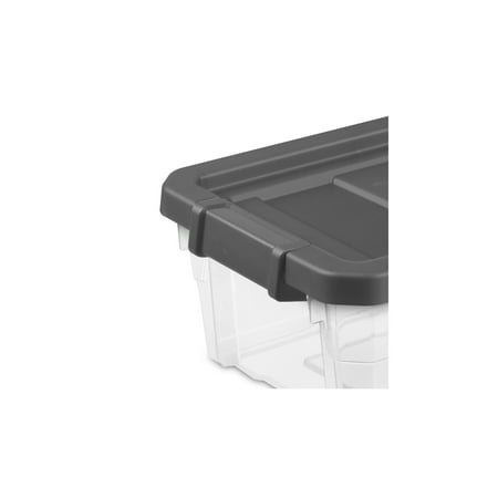 In need of a durable storage system for closets, basements, garages, or attics? The Sterilite Modular Stacker line features rugged construction for added peace of mind that contents will stay safely stored inside. The 16 Quart Stacker Box is the perfect size for shoes, accessories, small household tools and supplies, and the clear base allows quick viewing of contents. The robust latches offer extra security that the lid will stay attached to the base, and the textured surface makes for a sure grip when carrying. The deep recessed lids provide stability when stacking for efficient use of storage space. The 16 Quart Stacker Box shares the same lid as the 30 Quart Stacker Box allowing secure stacking of both the shallow and deep storage boxes in one footprint. The overall assembled dimensions of this item are 18" L x 12 5/8" W x 7 1/8" H.