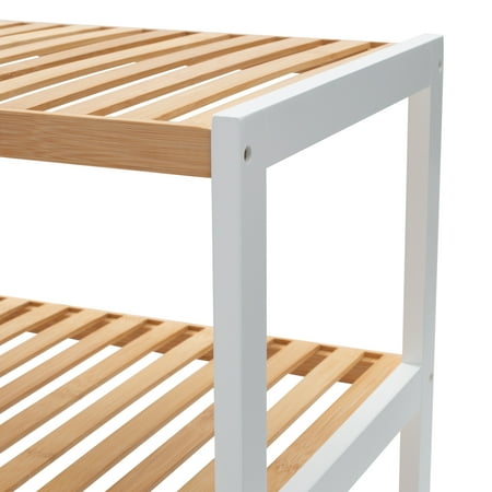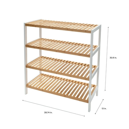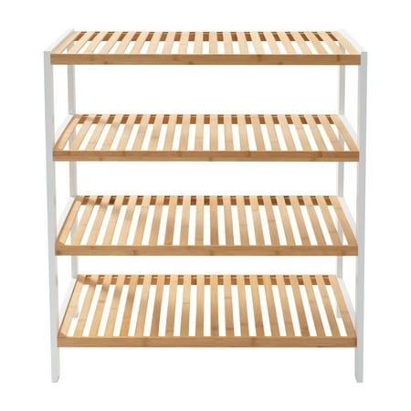 Put this Organize It All Adult Sonora Bamboo 4 Tier Shelf inside or outside of your closet to maximize storage space and keep your shoes organized. Easily place anywhere within your bathroom, bedroom, or closet. It holds up to 12 pairs of shoes. The shelves can also store clothes, towels, or other bathroom accessories. The bamboo and white finish are simple and modern and will look good in any room. Put this item in your entryway or bedroom to create a nice place for storage and to keep your shoes organized.
