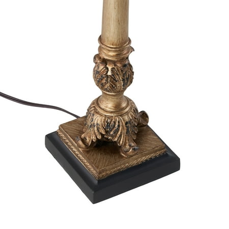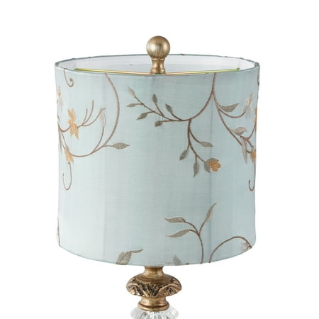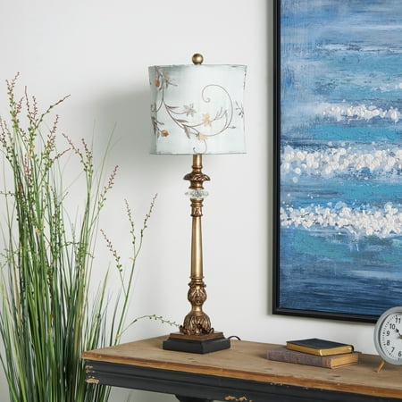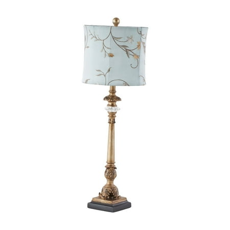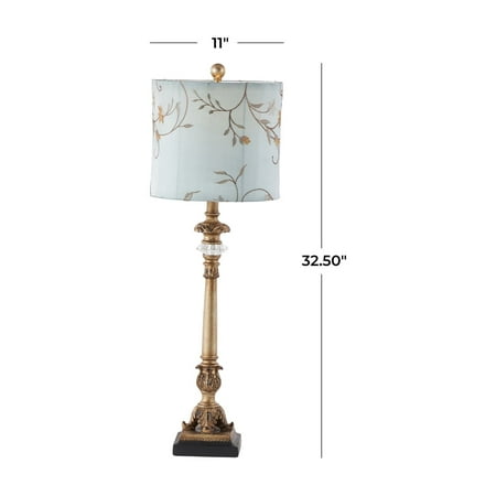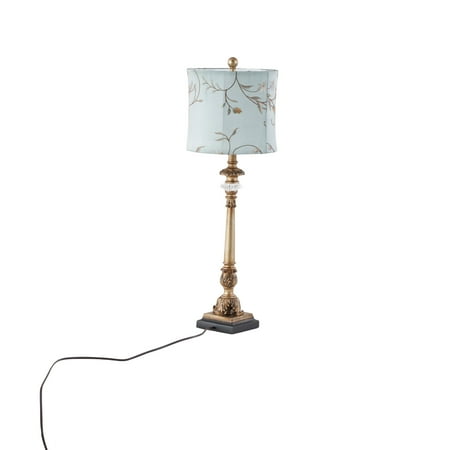 DecMode Antique Style Floral Gold Buffet Lamp with Blue Fabric Shade (2 Count) is a unique addition to your stylish home. A practical yet stylish upgrade that instantly elevate the look of your room. This eye catching lamp makes a playful addition to your surface space and beautifully illuminate its surrounding area. This floral set of 2 table lamps can elevate any interior space such as a lobby, living room, or bedroom. Designed with felt or rubber stoppers at the base that prevent scratching furniture and table tops, as well as sliding around. Requires 1 60W Type A E26/Medium (Standard) bulb. This item ships in 1 carton. Comes with a 58" cord length. Suitable for indoor use only. This item ships fully assembled in one piece. Buffet lamp comes with a blue drum shaped shade that measures 11 x 11 x 10 inches. Includes a rotary switch. This gold colored iron table lamp comes as a set of 2. Tuscan style.