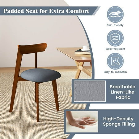 Elevate your dining experience with this set of mid-century modern dining chairs! Crafted from solid rubber wood, these chairs are sturdy and built to last. They boast a soft padded seat upholstered in skin-friendly, linen-like fabric and filled with resilient sponge for ultimate comfort. Designed with a wide and curved backrest, they perfectly contour to your body, offering optimal support for extended relaxation. The timeless design harmoniously complements various settings, from your chic dining room to a cozy study or stylish cafe shop. Our wood dining chair set can be a great addition to your space. Feature Solid rubber wood frame ensures long-lasting durability and high strength Wide and curved backrest provides optimal back support High-density sponge filling offers supportive comfort Breathable linen-like fabric is skin-friendly, wear-resistant, and easy-to-maintain Reinforced X-shaped braces and reliable connections for added stability Round corners and splinter-free surface for safe use Natural wood grains enhance its visual appeal Suitable for various settings such as dining room, study room, cafe shop, etc. Hassle-free setup and maintenance for your convenience Specification Color: Walnut + Gray Materials: Rubber Wood, Linen-Like Fabric, Sponge, MDF Overall Dimensions: 18" x 19.5" x 30.5" (L x W x H) Seat Size: 17" x 16.5" (L x W) Seat Height: 16.5" Weight Capacity of Each Chair: 220 lbs Net Weight of 2 Chairs: 18 lbs Package Includes: 2 x Dining Chairs 1 x Instruction