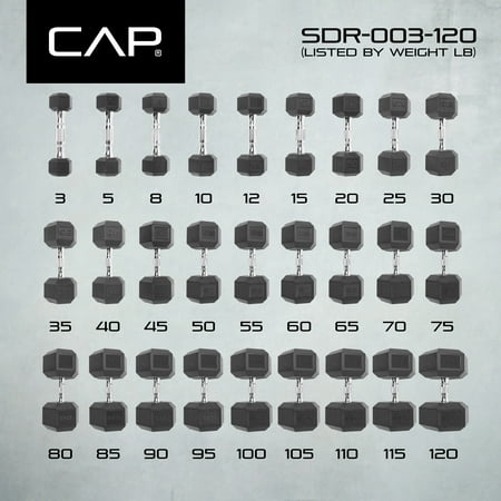 Enhance your workout routine with the CAP Barbell Coated Hex Dumbbell. This sturdy dumbbell is a premium quality weight that's ideal for home use. Made of solid cast iron with a protective black coating, it features an easy-to-grip handle and encased heads to prevent damage to floors. The ergo designed handle helps to reduce hand fatigue and maximize comfort, while the knurling prevents the dumbbell from slipping during workouts. The Hex shaped dumbbell heads ensure the dumbbell will not roll when set down, avoiding injuries and allowing for easy storage. Dumbbells can be used to exercise all major muscle groups, including arms, chest, back, abs, legs and core. Making them perfect for a full body workout. Sold individually.