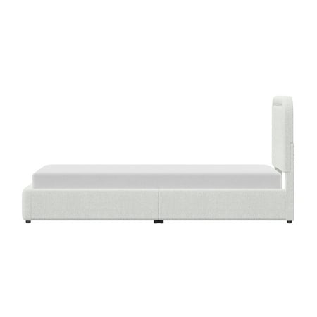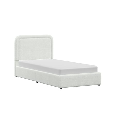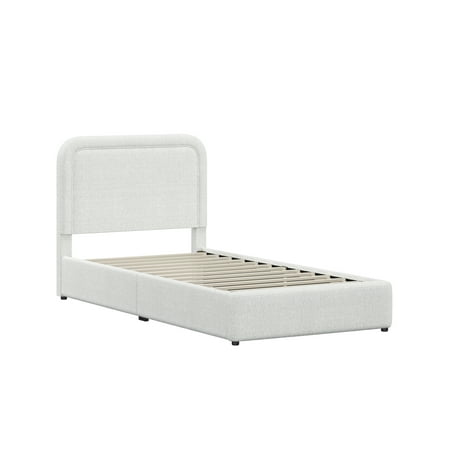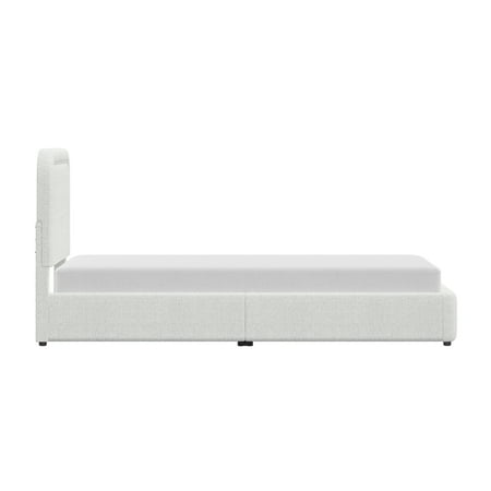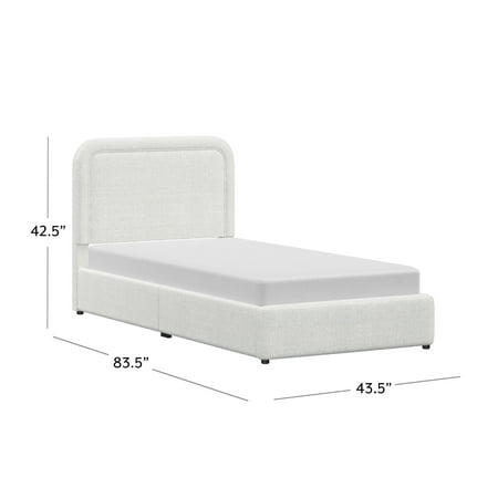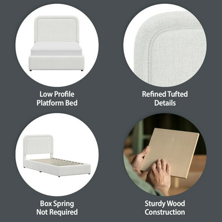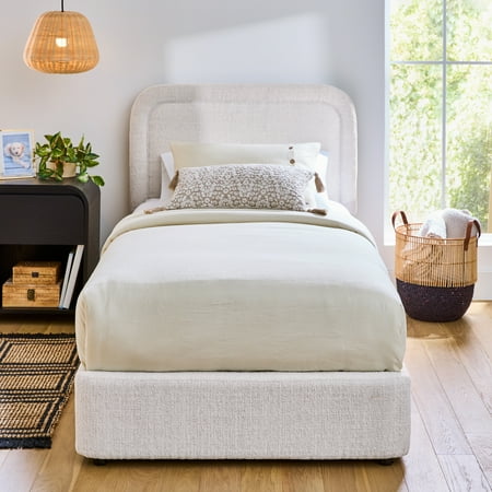 The Better Homes & Gardens Juliet Twin Boucle Platform Bed adds a modern, cozy touch to your bedroom with its warm ivory tone and soft boucle fabric. Featuring rounded corners, tufted edges, and hidden feet for a sleek, floating look, this adult low-profile bed offers easy access while saving space. Easy to assemble and crafted from durable wood, this bed provides reliable mattress support without the need for a box spring and is compatible with memory foam, hybrid, or innerspring mattresses (sold separately). With its luxe upholstery and polished finish, this modern platform bed combines comfort and high-end elegance to elevate your bedroom's look.