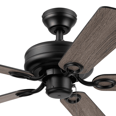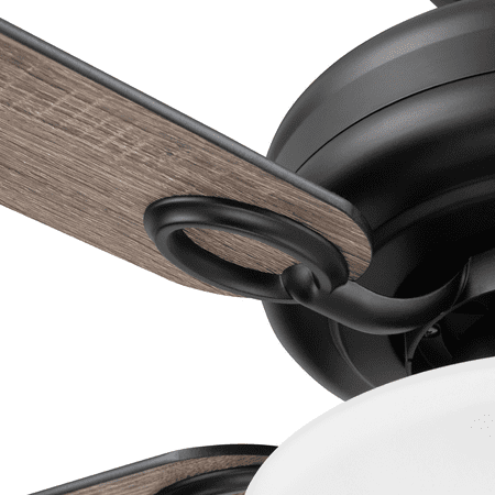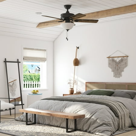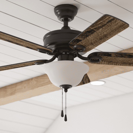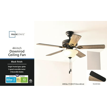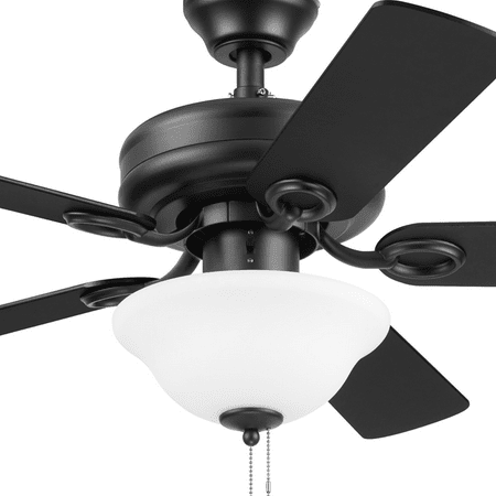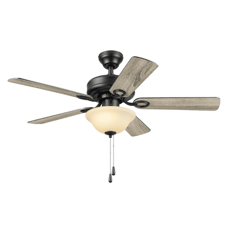 This classic style fan features stylish details and pairs well with most home décor. This black ceiling fan has a lightly frosted, open bowl shade to provide beautifully filtered lighting. The traditional 5-blade design provides comforting, adjustable airflow while the LED lights provide ideal lighting for the area. Easily control your ceiling fan's 3 speeds and turn the light on and off with the traditional pull chains. Use the reversible airflow switch to easily allow you to change the direction of the fan to properly distribute air. During warmer months, this fan will provide a cooling effect or when reversed during the cooler months, it will help distribute warm air. This ceiling fan was created with high-quality materials that are durable and long-lasting and comes with a limited lifetime warranty from the manufacturer. Specifications: Sizing: 44-in 5-blade indoor fan for rooms up to 100 sq. ft. Lighting: 2 x E26/A19 light bulbs included that provide 800 lumens, 8 watts, 2700k color temperature