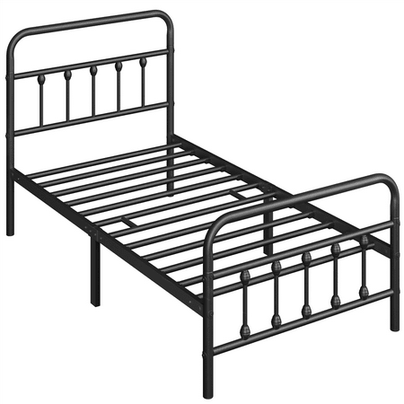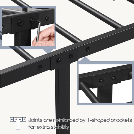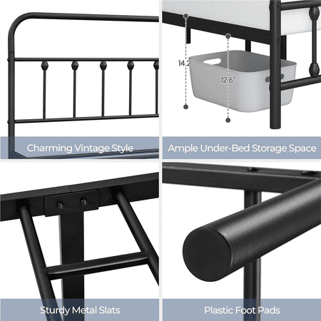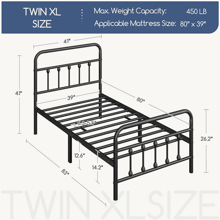 The bed is constructed entirely of a powder-coated metal frame, ensuring sturdy support and long-lasting durability. Cleaning is a breeze, requiring only a gentle wipe with a soft, dry cloth. The tall headboard not only offers protection for your head, but also enables a comfortable sitting position. With a clearance of 12.6 inches below the bed, you'll have additional storage space for miscellaneous items. Simple Assembly is required. Which is Suitable for all ages.