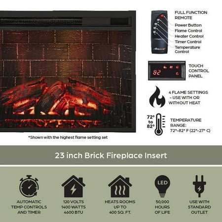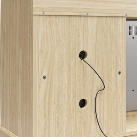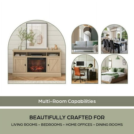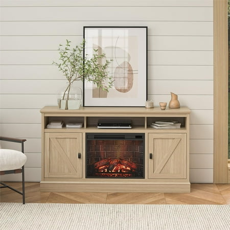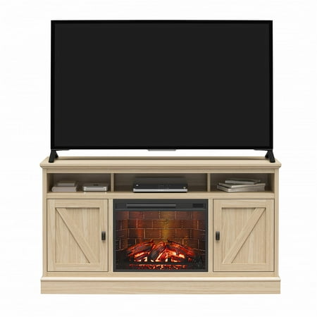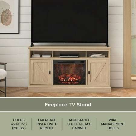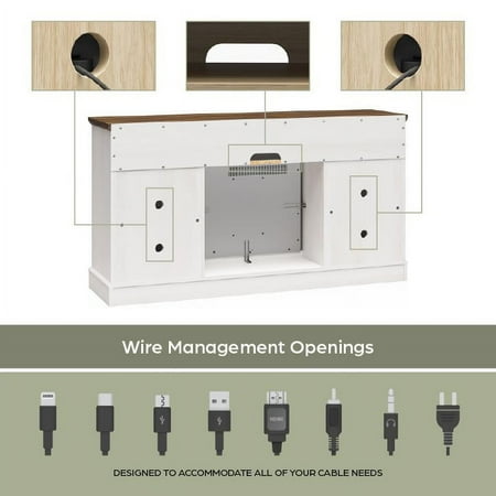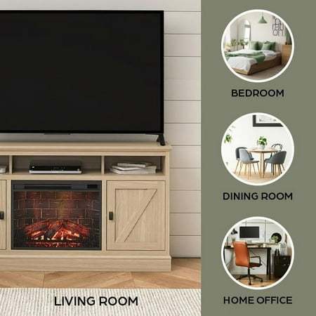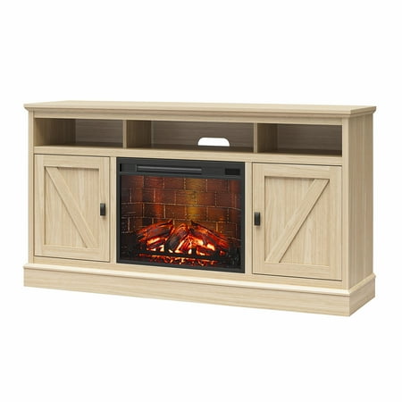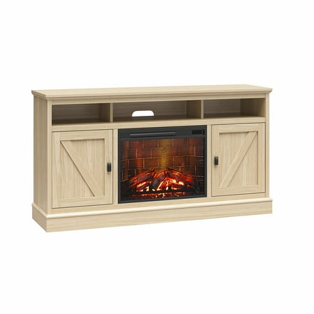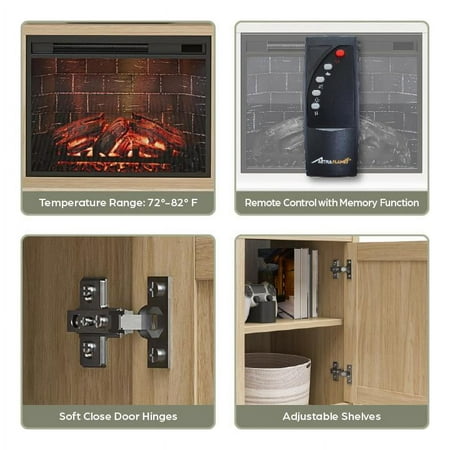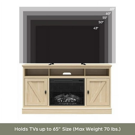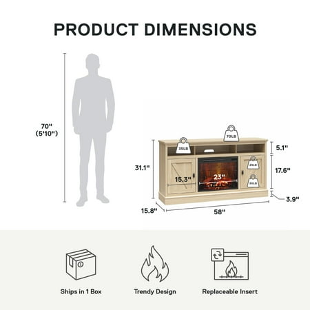 Elevate the ambiance of your home with the Ameriwood Home Ashton Lane TV Console with Fireplace and Remote Control, an excellent choice that brings warmth and charm to your living room, family room, or bedroom at an affordable price. This TV stand with fireplace heater features a convenient remote-controlled 23" electric freestanding fireplace insert, providing the mesmerizing glow of a realistic wood-burning flame without the hassle of upkeep. With the ability to heat up to 400 sq. ft., you can effortlessly achieve the perfect temperature ranging from 72° to 82° or opt for the soothing ambiance of the multiple brightness settings without the heat. The LED light source ensures long-lasting performance, boasting an impressive lifespan of up to 50,000 hours, guaranteeing years of enjoyment. The fireplace heater can be controlled by remote control with included AAA batteries or by the touchpad display. Designed to accommodate flat panel TVs up to 65" wide and weighing up to 70 lbs., this fireplace entertainment center offers practicality and functionality. It includes two side cabinets that discreetly conceal four storage shelves along with a spacious open divided shelf, perfect for organizing your cable box or gaming systems. Thanks to the clearly marked components, putting it together is simple, and our dedicated customer support team is always available to assist. The front remains cool to the touch, ensuring it's safe for children and pets. Additionally, replacement fireplace inserts help maintain the stylish look of your furniture for many years. This item ships in one flat box and requires assembly by two adults. Assembled measurements: 58" W × 15.75" D × 31.125" H.
