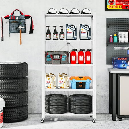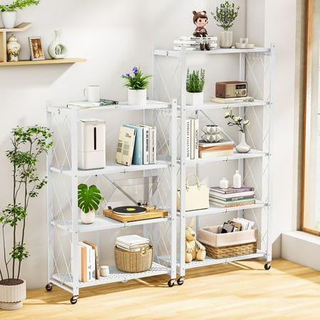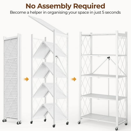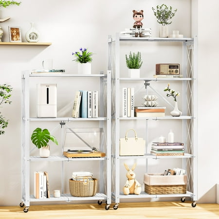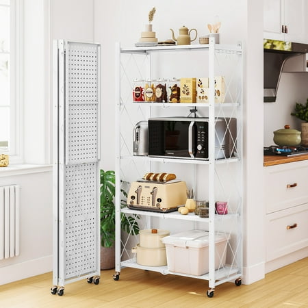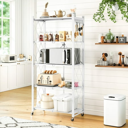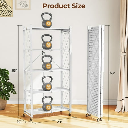 Simplify your storage with the Vebreda 5-Tier Foldable Metal Shelf. No assembly required—just unfold and use in seconds. Made from durable iron with lockable 360° wheels, it supports up to 750 lbs and folds flat for easy storage. Perfect for kitchens, garages, offices, and more. Key Features No assembly required—unfolds in 5 seconds for instant use. Foldable design for compact storage under beds or behind doors. Heavy-duty iron frame supports up to 750 lbs without wheels. 4 smooth 360° wheels (2 lockable) ensure easy movement and stability. Rust-resistant, durable, and ideal for long-term use. 4 spacious tiers provide ample room to organize home or office items. Perfect for kitchens, garages, pantries, offices, and laundry rooms. Specifications Type: Foldable metal storage rack Material: Iron metal (anti-rust & anti-corrosion) Color: White Tiers: 5 Open Size (with wheels): 28" L × 14" W × 63" H Load Capacity: 750 lbs (without wheels) / 300 lbs (with wheels) Wheels: 4 rubber casters (2 with brakes, 2 free-rolling) Assembly: Pre-assembled, folds/unfolds in 5 seconds Usage: Indoor (kitchen, pantry, garage, office, storage room) Packing List 1 × 5-Tier Foldable Metal Shelf 4 × Rolling Wheels (2 lockable)