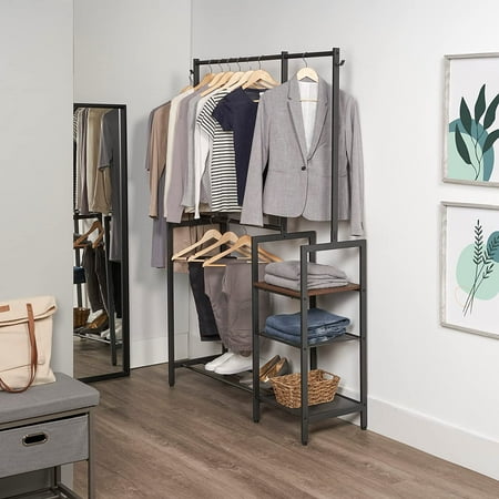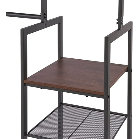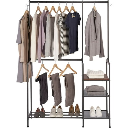 The Heavy-Duty Freestanding Wardrobe Unit offers a versatile storage solution with a double hanging rod layout, three vertical shelves, and a bottom shoe shelf to maximize organization. Designed for use inside or outside a closet, it provides ample space for clothes, accessories, and shoes. The wood-grained shelf adds style while offering extra storage for home essentials. A durable steel frame ensures stability, with foot levelers to balance on uneven floors. Side hooks accommodate longer garments, making it an efficient space-saver. With quick and easy assembly, this wardrobe is perfect for bedrooms needing extra organization. Multiple weight capacities included.