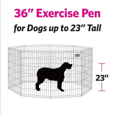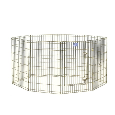 Midwest Homes For Pets brings you a durable and versatile exercise pen for your pet's safety both indoors and outdoors. Made from sturdy metal wire, this exercise pen features a sleek gold zinc finish that resists rust and environmental damage. The secure double-latch door allows easy entry and exit, while eight 24-inch wide panels provide ample space for your pet. Setting up is simple with no tools required; included ground stakes and corner stabilizers enhance stability and protect indoor flooring. Easily fold the pen for convenient storage when not in use. Backed by a one-year manufacturer's warranty.