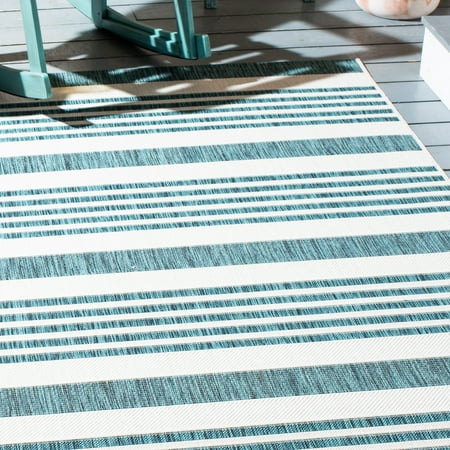 Shop more SAFAVIEH Outdoor Rugs at Walmart. SAFAVIEH Courtyard Rug Collection SAFAVIEH Courtyard Patrice Striped Indoor/Outdoor Area Rug, Ivory/Teal, 6'7" x 9'6" Courtyard indoor outdoor rugs bring interior design style to busy living spaces, inside and out. Courtyard is beautifully styled with patterns from classic to contemporary, all draped in fashionable colors and made in sizes and shapes to fit any area. Courtyard rugs are made with enhanced polypropylene in a special sisal weave that achieves intricate designs that are easy to maintain, simply clean with a garden hose.