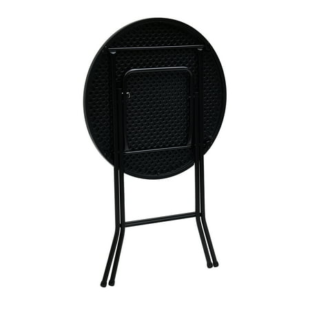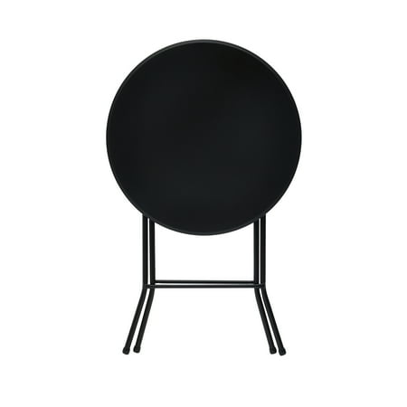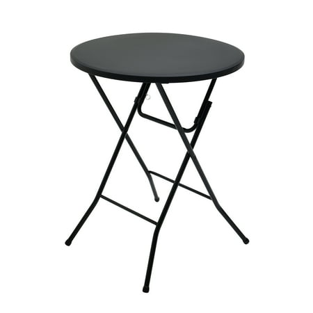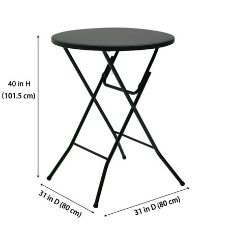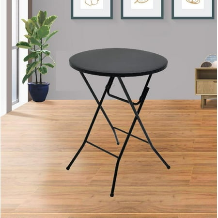 Provide all of the table spaces that you need in any room of your choice, with Mainstays 31" High Top Folding Table, Black. This versatile circular table is sturdy and durable, made with reliable materials, and folds for easy storage and transportation. When you're finished using it, just fold in the metal legs, and your new compact table is ready for transport! Its classic black finish is sure to fit in with the decor of any room around the house, adding additional table space for your friends, family, and guests. It's the perfect corner or side table, to add an accent of color to any room, while also providing practical additional table space for everyday use. Ideal for use beside the couch, chair, or bed. The plastic tabletop is easy to clean with no fuss - just wipe it down with a damp cloth, and it will look as good as new! Its collapsible design makes it perfect for taking with on the go, for outdoor barbecues, game nights, school activities, parties, or tailgating events. The 31" round tabletop is large enough to fit your game day snacks or seat up to 4 adults. Add some additional table space to the most frequented rooms in your home.