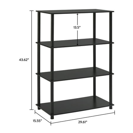 Get organized in style with Mainstays No Tools 4-Shelf Storage Bookcase. This attractive shelving system provides a welcome storage option for any living room, family room, playroom, or anywhere else extra organization is needed. As a part of the Mainstays No Tools Collection, assembly is simple, quick and requires no tools. With 13" between each shelf there is ample space for a variety of items. Whether you use it as a bookcase, plant stand, display shelf or something else, the Mainstays No Tools 4-Shelf Bookcase is a great value.