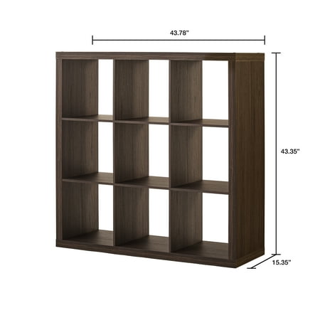Add function and style to your home with the Better Homes & Gardens 9-Cube Storage Organizer. Available in multiple finishes, including both solid and wood grain options, this cube organizer features nine 13" x 15" x 13" compartments, the perfect size to display books, collectibles, photos, artwork, storage bins and baskets. An open back design makes it easy to manage cords and cables. The top panel of this sturdy bookcase supports up to 100 lbs and each cube supports up to 30 lbs. Combine it with other Better Homes & Gardens Cube Organizers and Cube Storage Bins (sold separately) to create a complete, customized storage and display system. Easy to assemble with included wall attachment system, the Better Homes & Gardens 9-Cube Storage Organizer is perfect for your office, living room, den, playroom and more.