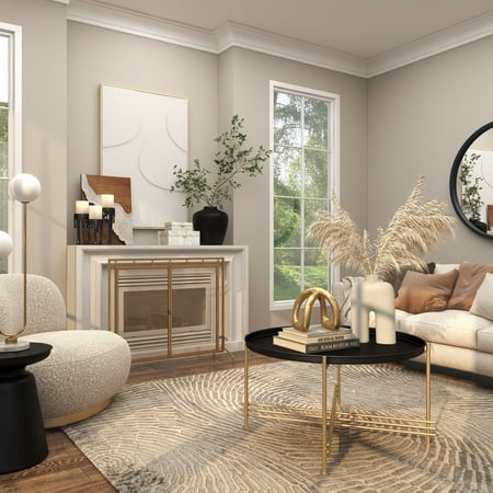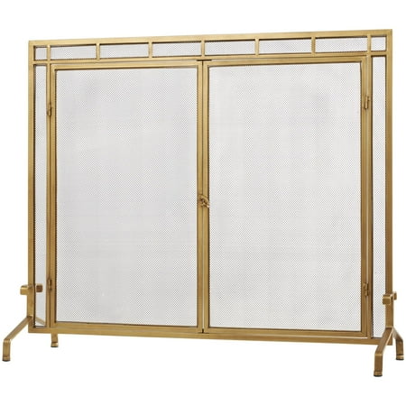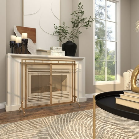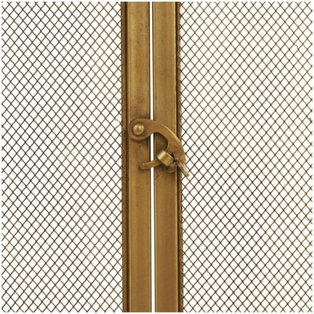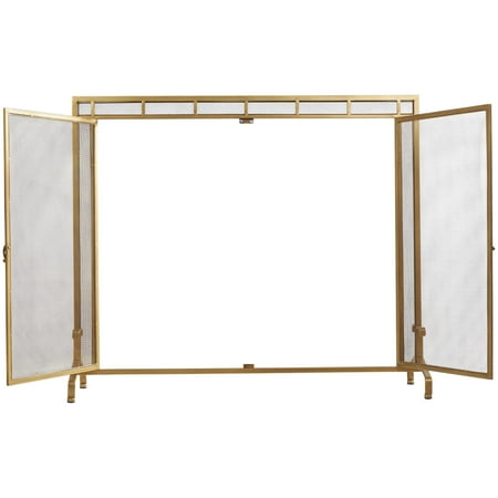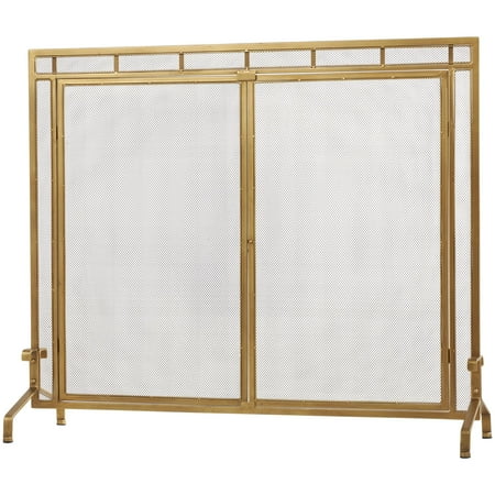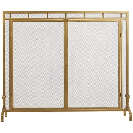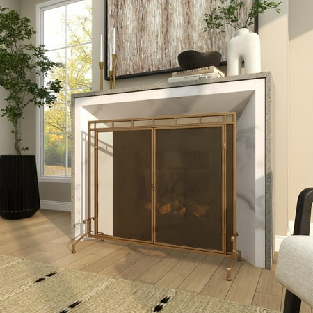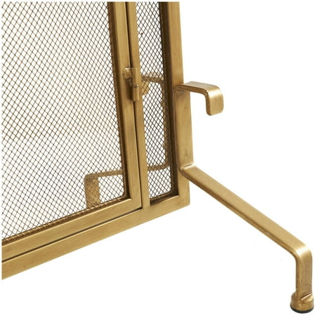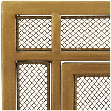 DecMode 39" x 34" Gold Metal Geometric Single Panel Fireplace Screen with Latched Doors and Arched Feet, 1-Piece is a unique addition to your stylish home. Add style and charm with this gold fire spark guard covering your fireplace or try placing it in front of a candle cluster for a warm, homey feel. This item ships in 1 carton. Please note that this item is for decorative use only. Suitable for indoor use only. This item ships fully assembled in one piece. Item features a single panel screen. This is a single gold colored fire spark guard. Modern style.