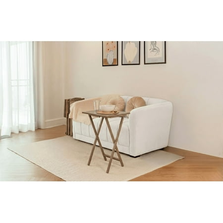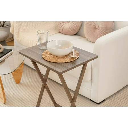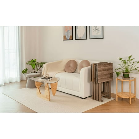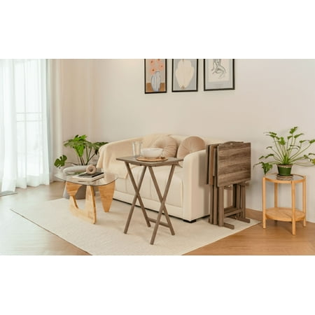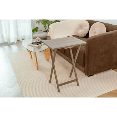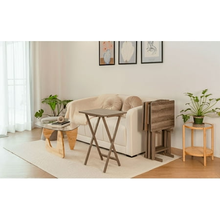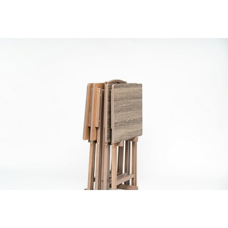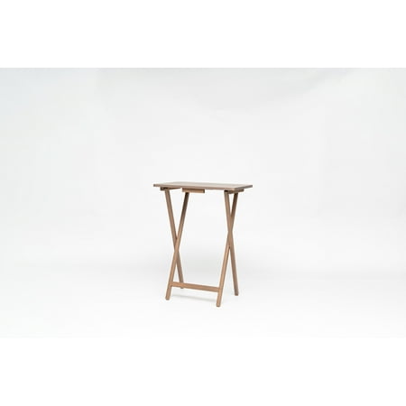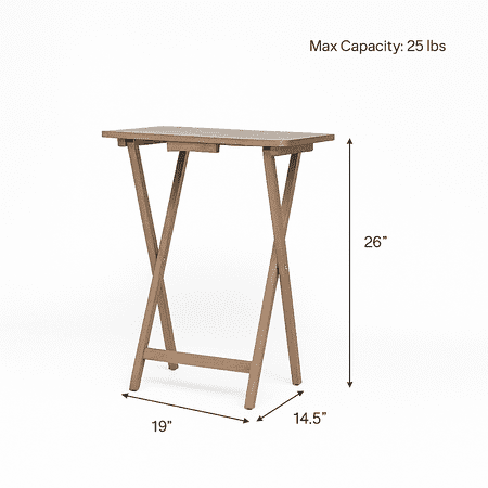 Add convenience and versatility to your home with the Mainstays Folding TV Tray Table Set of 4 with Storage Rack. Crafted from durable solid rubberwood, each tray offers a sturdy surface ideal for meals, laptops, or crafts. Measuring 19" L x 15" W x 26" H, each lightweight table weighs just 7.5 lbs yet supports up to 25 lbs. The folding design allows for easy storage when not in use, and the included rack keeps all trays neatly organized. Perfect for family rooms, apartments, or small spaces, this set combines functionality with everyday style and durability.