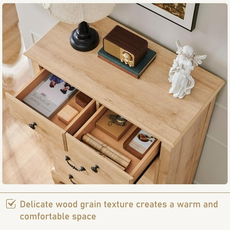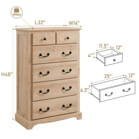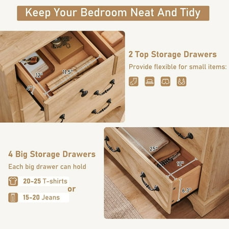 OKD 6-drawer Wooden Dresser provides ample storage space and serves as home decoration. Made of durable engineered wood with a smooth finish for easy cleaning. This wooden chest of drawers has 4 large drawers and 2 small drawers, each with smooth metal slides that can be easily pushed in and pulled out, providing ample space to store and sort your items, keeping your home tidy. The top space can bear a load of 100 lb, and daily necessities can be placed for easy access. This modern storage cabinet is equipped with an anti-dumping device, giving the family a sense of security.