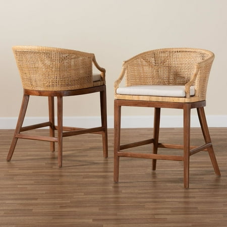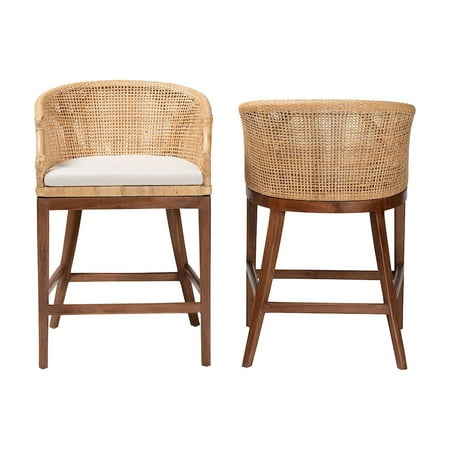 The Lumajang dining chair melds modern taste with exotic poise. Crafted in Indonesia, this bohemian piece consists of a sturdy acacia wood base fitted with a removable cushion and topped with an elegantly crafted natural rattan frame. Its round back is beautifully embellished with woven rattan while cutout armrests encourage cozy relaxation. The Lumajang will arrive fully assembled and is fitted with a convenient footrest for added comfort. Angled legs complete the sleek silhouette, making the Lumajang dining chair a refreshing addition for any layout. Disclaimer: Rattan is a product of nature and may have variations in areas such as, but not limited to, color, pattern, grain and texture. The hair-like strands of rattan/rattan-fiber are common due to the nature of the material. Features: Bohemian Counter Stool Set Includes Two (2) Counter Stools Constructed from Natural Rattan and Acacia Wood Low-Back design with scalloped armrests Fabric-upholstered, foam-padded removable seat cushion with washable cover Ergonomic footrest Fully assembled Specifications: Product Dimensions: Overall: 22.80" W x 23.00" D x 35.00" H; Seating: 19.70" W x 18.10" D x 23.60" H; Backrest(from seat up): 11.40" H; Clearance(floor to lowest stretcher): 7.10" H; Clearance(floor to bottom of seat): 22.00" H;
