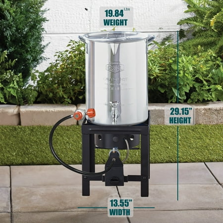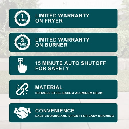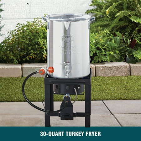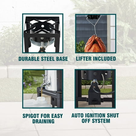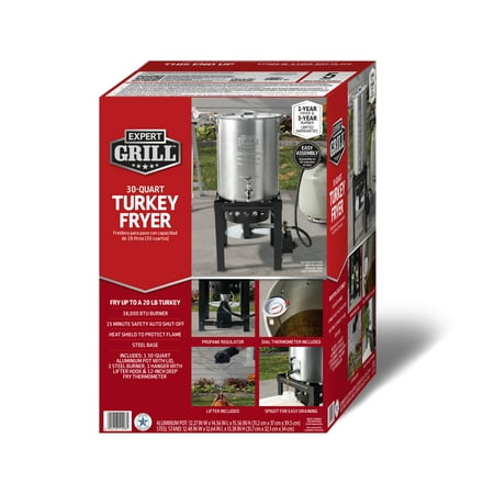 Expert Grill 30qt Turkey Fryer with Spigot Turkey Fryer includes pot and lid with Hanger & lifter hook with Spigot. Expert Grill 30QT Turkey Fryer is Ideal for cooking turkey, this durable steel stand and aluminum pot provide reliable support and confidence when preparing birds up to 20 lbs. Spigot makes draining oil fast and easy, saves time and efforts during cleanup. 38000BTU cast iron burner distribute adequate amount of flame to fry the Turkey and Auto shut-off timer enables the safety. 12” Thermometer allows to check the heat of the content inside the pot.