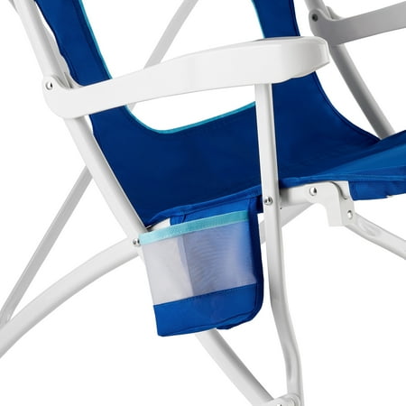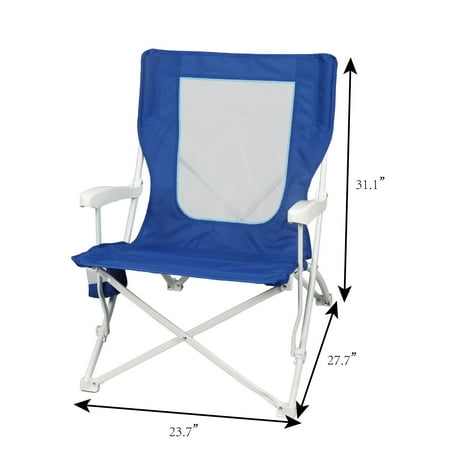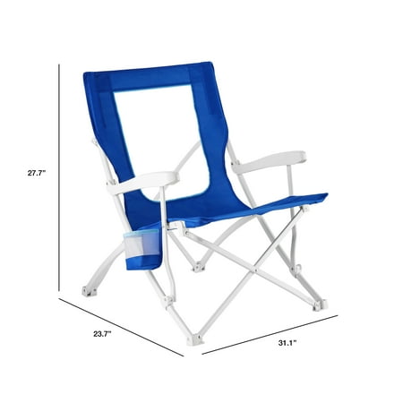 The durable new Mainstays Folding Hard Arm Beach Bag Chair features a powder-coated steel frame for rust resistance and a comfortable 15” seat height for easy access. Its flow-through mesh back ensures excellent ventilation, while the oversized cup holder adds convenience. Lightweight and portable, this chair folds compactly for easy storage and comes with a carry bag for effortless transportation. With a weight capacity of up to 300 pounds and construction from 50% recycled polyester, it blends durability with eco-friendly design. This is a pack of 2 chairs.