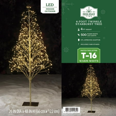 Bring a magical glow to your holiday decor with the Holiday Time 4-Foot Pre-Lit Gold Artificial Christmas Tree. Standing four feet tall, this elegant tree features numerous slender branches adorned with 500 ultra-slim wire LED lights that shine in warm white. For added sparkle, 20% of the lights have a random twinkling effect, creating the look of a starlit night. The lights are evenly distributed to cast a soft, inviting glow throughout your space. A sturdy champagne gold square base and matching gold pole provide both stability and a polished finish, while a clear cable and ETL-approved power adapter make setup simple. Designed for both indoor and outdoor use, this versatile tree includes a yard stake for secure placement outside. Perfect for homes, offices, or festive events, the Holiday Time 4-Foot Pre-Lit Gold Artificial Christmas Tree adds timeless charm and radiant ambiance to your holiday season.