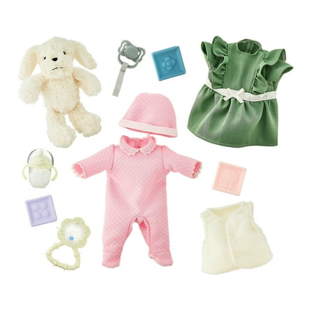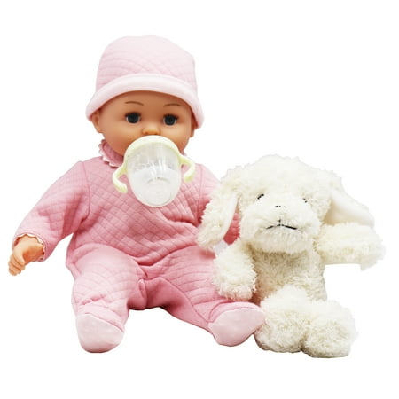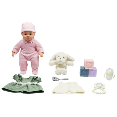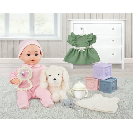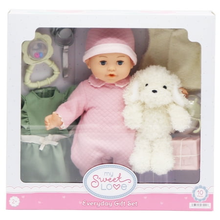 This adorable 14-inch soft My Sweet Love Baby Doll is the perfect cuddle companion. With a plush body that's oh-so-huggable and a sweet face, your little one will love playing pretend all day long. This doll comes with everything needed for nurturing fun, including an extra outfit to change, a cuddly plush dog, a magic milk bottle for feeding, a pacifier for soothing, a cute rattle, and three fun toy building blocks. Watch your child's imagination grow as they snuggle, care, and explore with their new best friend. My Sweet Love Baby Doll is found exclusively at Walmart and Walmart.com.
