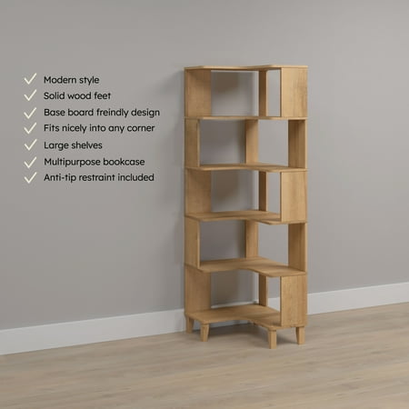 The Prepac Natural Oak Nordik Corner Bookcase offers a unique blend of style and functionality, making it stand out as a perfect storage solution for various rooms. This corner bookcase is designed with extra height, providing greater storage capacity compared to standard corner bookshelves. The thick, solid sides and sturdy build make this corner bookshelf with storage capable of holding a wide range of items, from books to decorative pieces. Its unique leg structure ensures it sits flush against walls, maximizing space. Measuring 23.25" D x 23.25" W x 71.5" H, this mid-century bookshelf seamlessly fits into any corner, making it an excellent choice for living rooms, home offices, bedrooms, or kitchens. Whether you're looking for a corner bookshelf to match your décor or a book shelf corner display to showcase your favorite items, this bookcase blends functionality with style. The sleek design, available in white, easily complements a variety of décor styles, including modern bookcase and mid-century modern bookshelf aesthetics, adding a touch of elegance to your home. For those seeking versatility, this modern corner bookshelf serves as an excellent choice for organizing and displaying items while enhancing room decor. If you're a fan of modular or statement pieces like the Tribesigns bookshelf or looking for an L-shaped bookshelf that fits into any bookshelf corner, this bookcase has you covered. Its minimalist yet sophisticated appearance is perfect for any space.