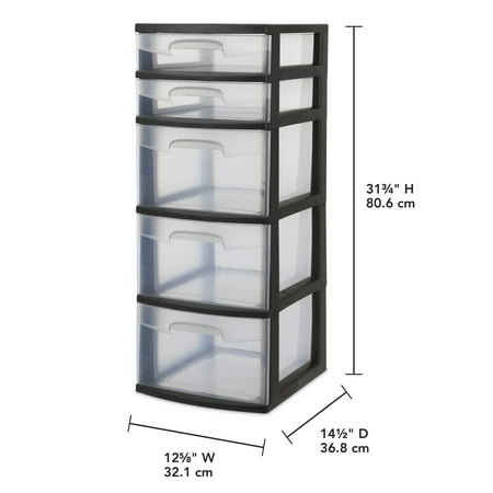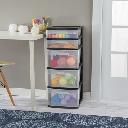 This Sterilite 5-Drawer Tower helps to keep your busy life in order. It helps upgrade your storage options, and has a modern style that blends in with most decor. This black drawer tower features clear compartments that are helpful for holding multiple items. Plus, it gives you a simple way to organize a cluttered bathroom and is suitable for makeup, towels, hair accessories and so much more. This Sterilite tower also makes a handy addition to children's playrooms. Keep their toys, games and art supplies stacked neatly in one place. The modern design helps it to be stored in the open to maximize space, while the clear material makes it easy to see the contents inside. It also comes in handy for arranging craft supplies and sewing items, or for keeping office supplies such as paper and stationery neatly tucked away.